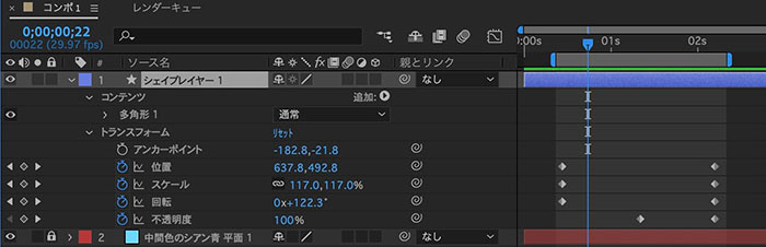 ※シェイプレイヤーは任意形状を作成するので形状や色に関わるプロパティも全て開かれる