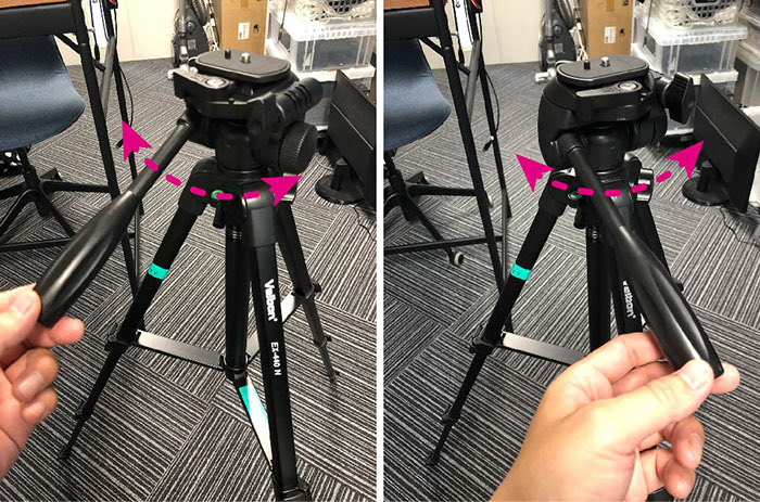 ここでは、南大沢キャンパス12-212教室で用意されているVelbon EX-440 Nを利用する。安価な部類に入る三脚ではあるが、一眼レフ程度の耐荷重を持ち、クイッククシューも実装されている。ビデオ撮影のカメラワークには不向きでカメラを固定した撮影に適している。